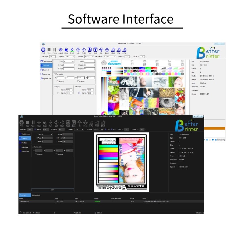 | Phần mềm RIP | Phần mềm RIP phổ biến như MainTop, Photoprint, UltraPrint, ONYX, Wasatch, vv | Hỗ trợ chức năng | Được trang bị chức năng RIP, in nhiều lần, in nhiều chu kỳ đặt hàng, in chống va chạm, đo chiều cao tự động, in điểm thay đổi, in thiết bị tắt điện,tự động thiết lập lại, in ngắt kết nối, phát hiện sự thiếu hụt giấy, tự kiểm tra mực, vv |